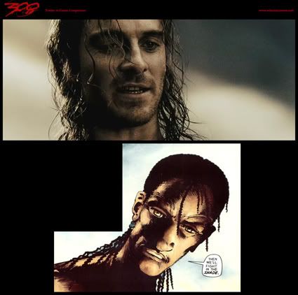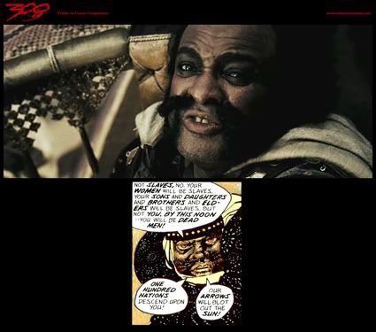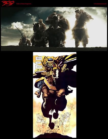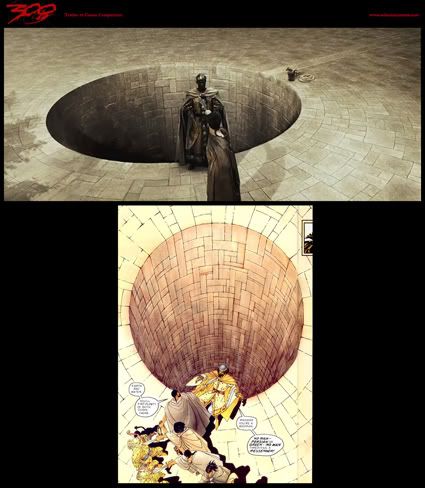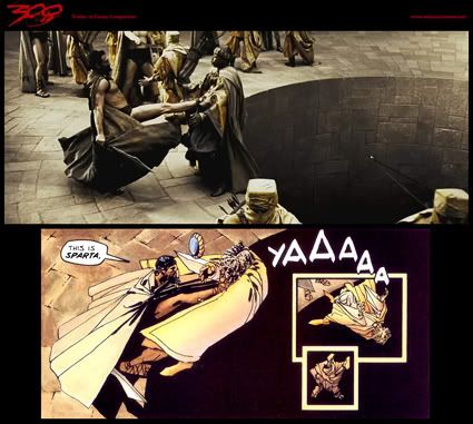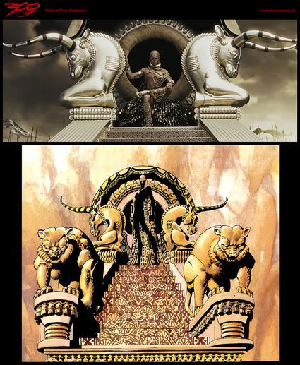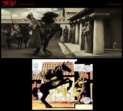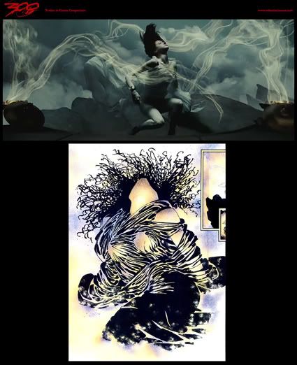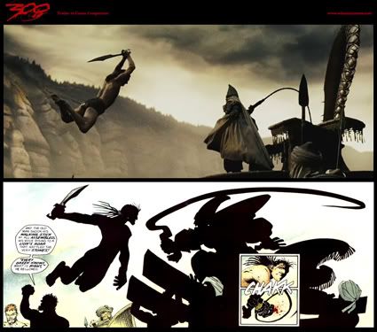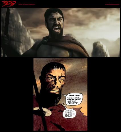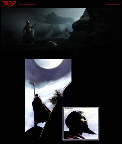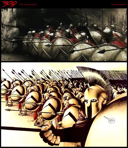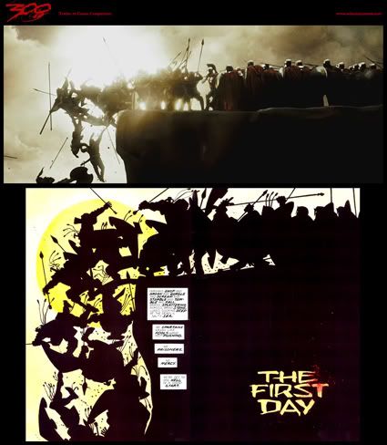 El hecho que me ha llevado a escribir este articulo es la reciente adaptacion que se esta llevando al cine de esta obra que hace sus años cuando me hice con ella me gusto bastante. Esta adaptacion vera la luz el 9 de marzo de 2007 y sera dirigida por Zack Snyder. Y la verdad viendo el trailer la peli promete, y seguramente este a la altura de SinCity. Aqui dejo varias comparaciones de viñetas del cómic con fotogramas del trailer, en las que se puede apreciar el grado de fidelidad (salvando las distancias entre ambos medios, claro) que promete el largometraje. Y si tras el trailer y las comparaciones os quedais con ganas de más podeis saciaros con las siete primeras paginas del comic (en ingles) y con unos cuantos fotogramas.